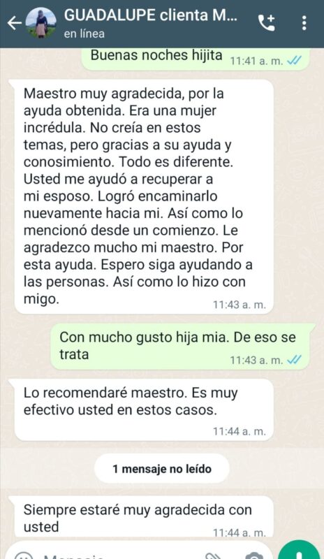 ¿Tu ser amado se ha alejado de ti? Con mis amarres de amor, puedo hacer que regrese a tu lado en poco tiempo. Ya sea que se haya distanciado por terceros, desamor o decisiones personales, este conjuro está diseñado para traer de vuelta a tu persona amada, sin importar el género o la situación.
